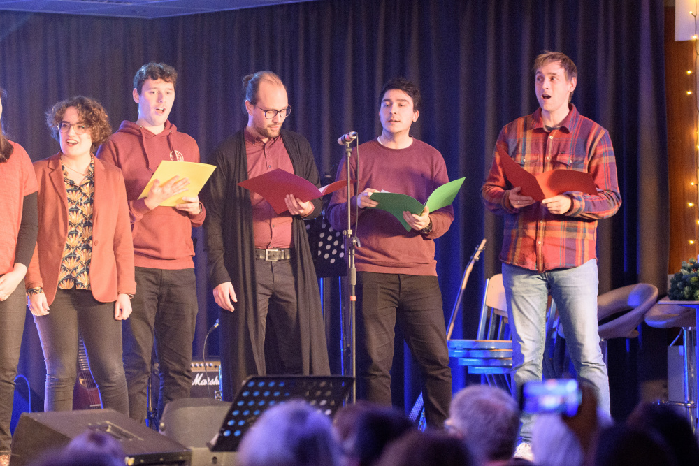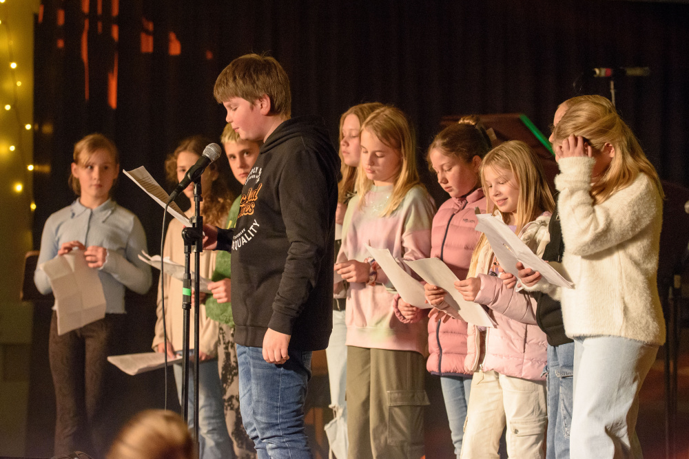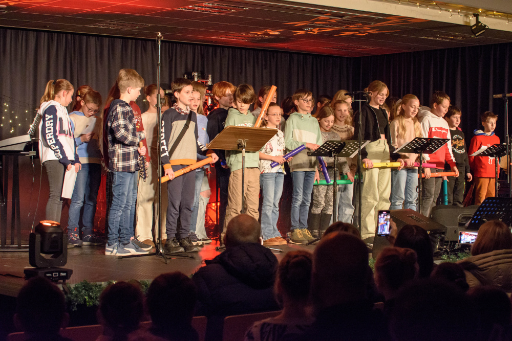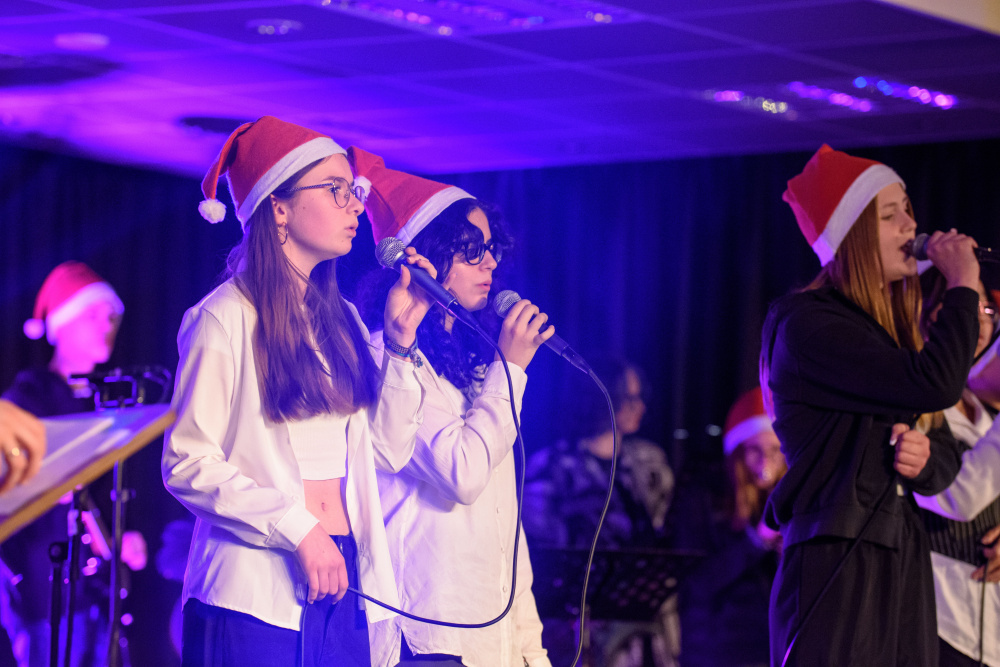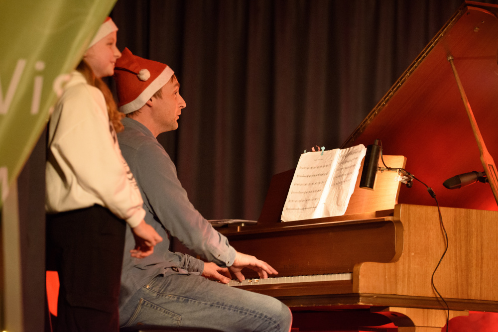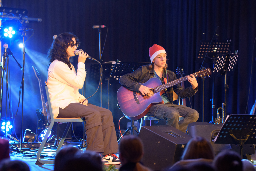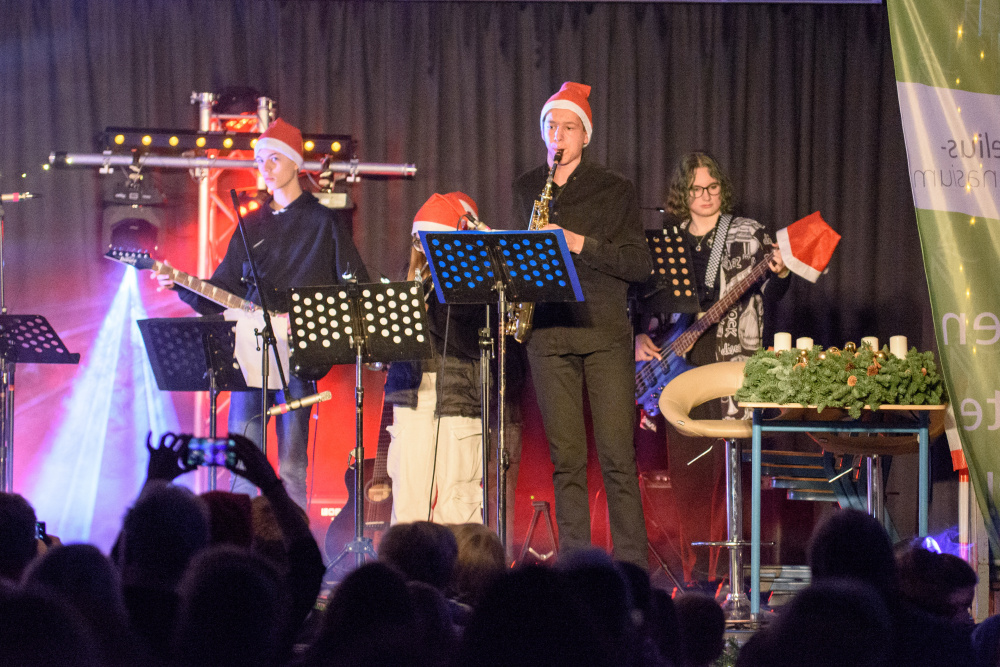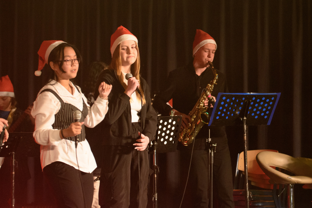 Nach der Pause mit netter Verpflegung durch die Schülervertretung, die Beehive-AG und den Jahrgang 13 bestimmte unsere Schulband „Next Generation“, dirigiert von Lutz Henschen, das Programm. Sie zeigte, was sie sich in dem noch kurzen Schuljahr bereits alles erarbeitet hat. „Über 100 Jahre Winter- und Weihnachtslieder von insgesamt 14 Schüler:innen aus den Jahrgängen 7–11“, fasst es Henschen zusammen. Die Band spielte u.a. ein Mashup von „Seven Nation Army“ und „Sweet Dreams Are Made Of This“, „Santa Tell Me“, „Santa Claus Is Coming To Town”, “Jingle Bells” mit einem Trompeten-Solo des Geburtstagskinds Anna (7a) und “Jingle Bell Rock”. Saxophon-Soli von Onno aus der 9c variierten einige Songs. Im Duett präsentierten Crystal (Gesang, 7a) und Pepijn (Gitarre, 7b) “Ocean Eyes“ von Billie Eilish.