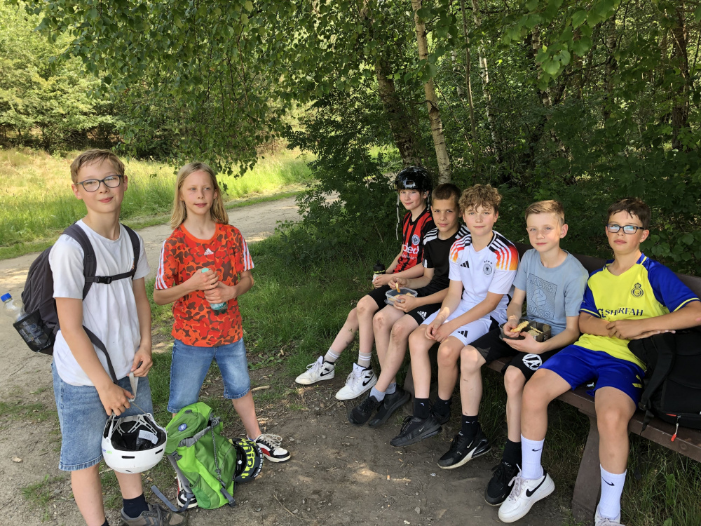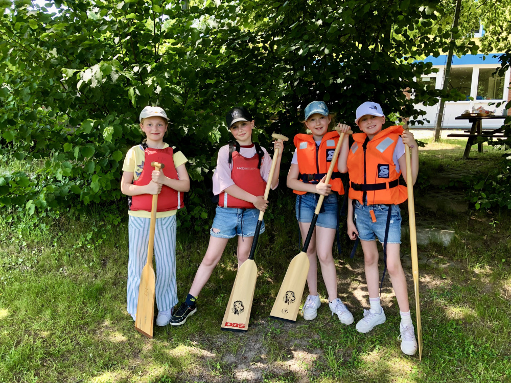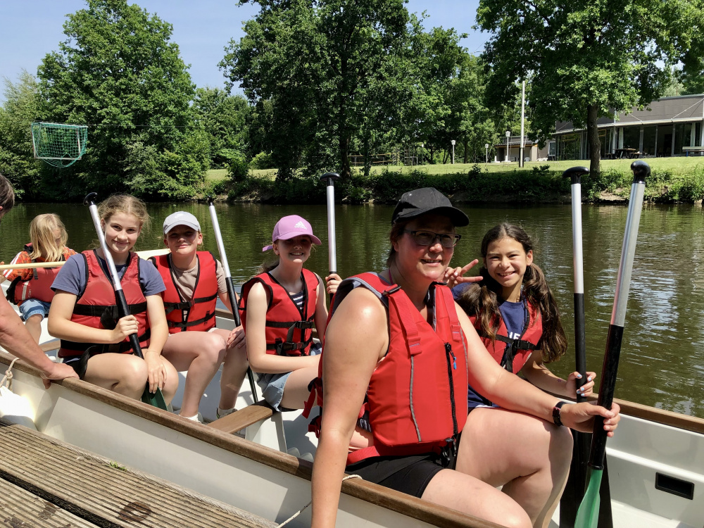 Natürlich lachte auch die Sonne, als die Klassen 5c und 5d sich am Freitag, dem 13. (Juni 2025), von Bramsche aus auf den Weg machten, um das Drachenbootfahren zu erproben. Per Rad am Kanal entlang oder zu Fuß über den Piesberg ging's zum Wassersportverein (WSV) Osnabrück. Eine Art Kanu für 20 Personen, mit Trommel, Drachenkopf und Schwanz versehen, wartete auf sie. Auf dem Stichkanal war dann Paddeln angesagt, vorwärts, rückwärts, mit- und gegeneinander und auch mal in die Runde. Dass es beim Drachenbootfahren nicht auf die Kraft des Einzelnen ankommt, sondern auf das Team und seinen Zusammenhalt, entdeckten Fünftklässler:innen schnell. Zum Abschluss wurde auf dem Schulhof gegrillt bzw. gepicknickt, lecker vorbereitet von den Eltern. Schön war’s. Danke an alle Mitwirkenden!