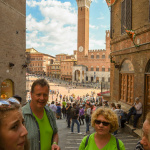 Der Torre del Mangia bietet als Aussichtspunkt einen sagenhaften Blick auf die Stadt und die umliegende Toskana. Rund um den Piazza del Campo findet zweimal jährlich zu Ehren der Maria Himmelfahrt (Palio dell'Assunta) das berühmte Palio di Siena statt, ein traditionelles, schon aus dem 13. Jahrhundert stammendes Pferderennen. Bei diesem spannenden und überaus ruppigem Ereignis, das sich im Laufe der Jahrhunderte kaum geändert hat, treten Vertreter der 17 Contraden (Stadtteile) gegeneinander an. Bilder davon finden sich überall in der Stadt.