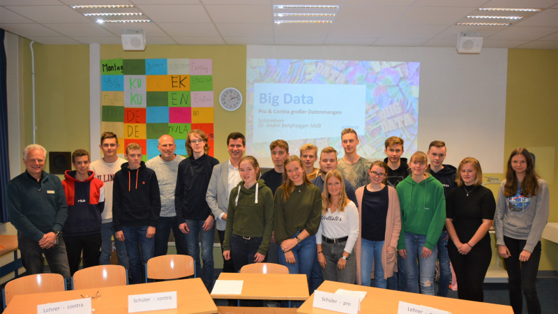 Berghegger hatte die Schirmherrschaft für Projekttage dieser Art im Landkreis übernommen, weil er den Wandel des Umgangs miteinander im Zeitalter der Digitalisierung als einen sehr deutlichen wahrgenommen hatte. Am Dienstag wollte er sich selbst ein Bild davon machen, welche Gedankengänge denn der Workshop bei den Schülern angeregt hatte. Nach einer kurzen Vorstellung seiner Person ging es Berghegger im Austausch mit den Schülern um Fragestellungen, was denn von vermeintlich harmlosen Daten alles ausgelesen werden könne.