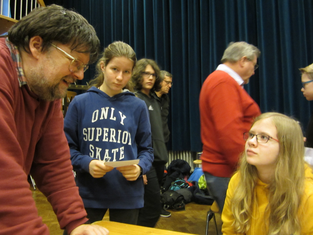 Von 09.15 bis 13.45 Uhr Wettkämpfe mit Unterstützung durch Begleiter: Neben dem Taktiklehrer der Schach-AG Rainer Anthonsen und dem AG-Leiter Detlef Neumann, beide zum letzten Mal im Einsatz für die Schach-AG, fuhren auch zwei Schülerinnen mit nach Osnabrück: Lara Bischof, die in den vergangen drei Jahren bei den Wettkämpfen stets zweite oder dritte Plätze erreicht hatte, und Melinda Scuric. Beide Mädchen hätten mit zwei anderen gerne in ihrer Wettkampfgruppe an den Unterbezirksmeisterschaften teilgenommen. Die zwei anderen hatten es sich aber anders überlegt.