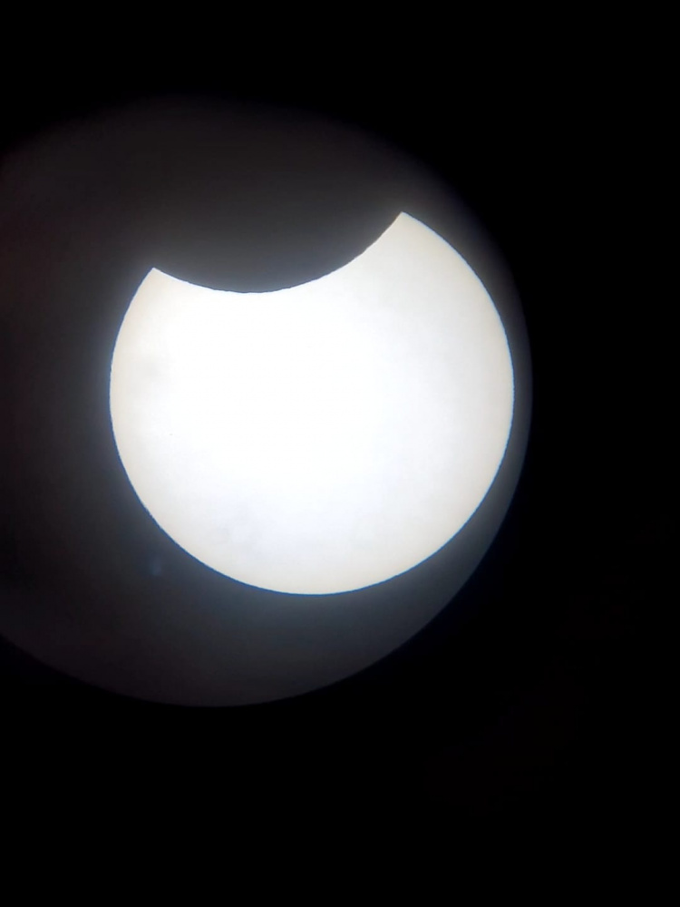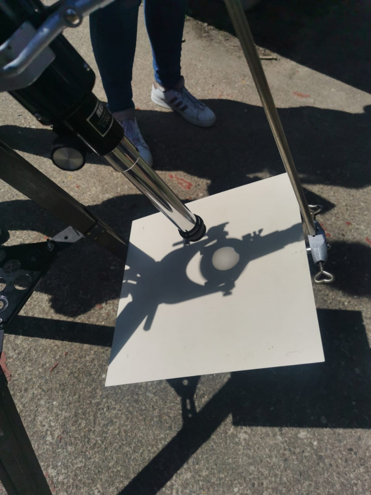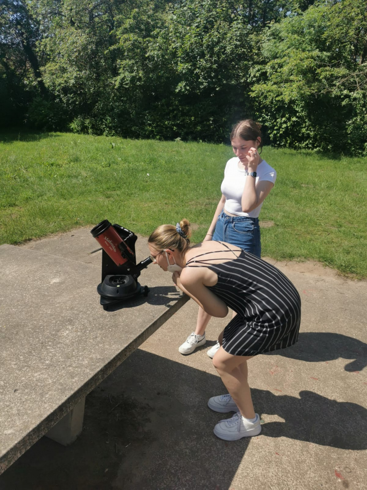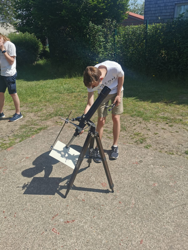 Am Mittag des 10.6. trat der Mond zwischen die Sonne und die Erde und verdeckte so einen Teil der Sonne. Unser Astronomie-Kurs Jg. 12 unter der Leitung von Herrn Riemer beobachtete diese partielle Sonnenfinsternis auf dem Schulhof bei besten Bedingungen. Um eine sichere Beobachtung zu garantieren, baute der Kurs drei Teleskope auf, eines mit einer Projektionsfläche, eines mit einer Herschelkeil und ein H-Alpha-Teleskop, die teilweise vom Astrogarten Bramsche zur Verfügung gestellt wurden. Natürlich standen auch einige Schutzbrillen zur Verfügung. Viele Klassen besuchten diese Beobachtungsstation und wurden so Augenzeugen des Naturphänomens. Vor allem mit dem Herschelkeil konnten die Schüler auch Handyfotos von der Finsternis machen, bevor der Mond die Bahn der Sonne wieder verlassen hat.