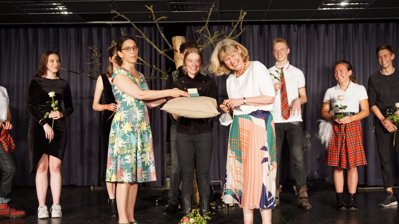 Nach der „Macbeth“-Premiere am 16. Juni gab es eine Überraschung. Die „Theatralen“ verliehen dem „GGB-Bären“ wegen seiner vielen Schließdienste die Ehrenmitgliedschaft in ihrer Gruppe. Er darf künftig seine Besitzerin, Schulleiterin Barbara Bolz, mit zu den Aufführungen bringen. Für sie war es die letzte Theateraufführung ihrer Amtszeit, so dass diesmal nicht nur sie Rosen verteilte, sondern als Dank für die Unterstützung selbst einen Strauß bekam.