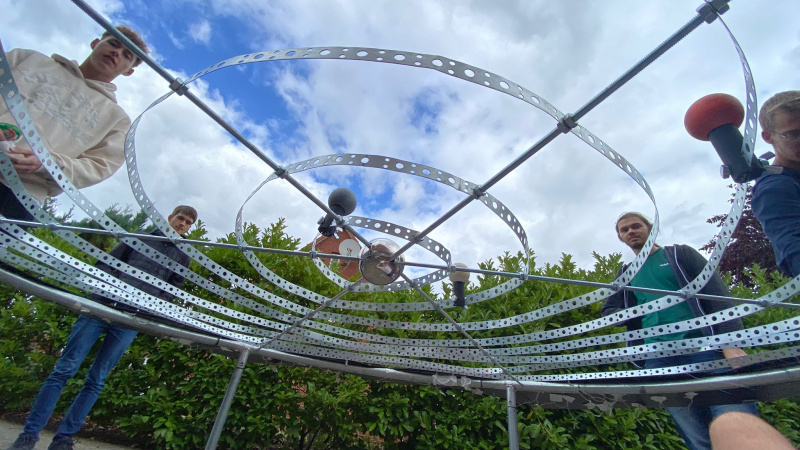 Damit diese Präzision und Aktualität möglich wurden, musste der Kurs sich nicht nur theoretisch in der Astronomie fit machen, sondern auch ganz praktisch kreativ werden. Lochleisten aus Metall bilden die Bahnen; die Planeten, passend bemalte Holzkugeln, wurden darauf geschraubt; als Sonne fungiert eine Metallkugel, die wie eine Spinne in der Mitte ihres Netzes hockt. Ein großer breiter Außenkreis aus schwarzen Holzplatten „rahmt“ das achtschalige Sonnensystem (ohne Pluto) ein. Die Abiturient:innen schraubten diese außen an eine Trampolinumrandung. Tierkreiszeichen zieren die Platten, verdeutlicht durch eingesteckte LEDs, die in der Nacht die Sternbilder zum Leuchten bringen. Und in Bramsche leuchten die Sterne auch bei von Wolken bedecktem Himmel.