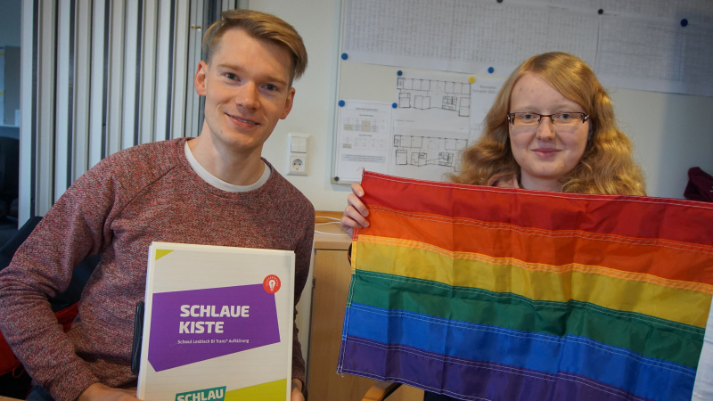„Klassische Antidiskriminierungsarbeit mit biografischem Ansatz“ – So fasst Simon das Motto der Workshops zusammen, die er mit seiner Kollegin Lisa bei uns im Jahrgang 10 gehalten hat. Er engagiert sich seit einigen Jahren, Lisa seit circa einem Jahr in ihrer Freizeit für SCHLAU, laut Homepage „eine ehrenamtlich organisierte Gruppe von Menschen, die anhand ihres persönlichen Hintergrundes über die Vielfalt von Lebensweisen, insbesondere von Lesben, Schwulen, Bisexuellen und Trans*personen (LSBT*) aufklären und informieren.“ Es geht um Einblicke in Lebenswelten, das Coming-out, Vorurteile und Diskriminierung und natürlich auch darum, Mut zu machen, den eigenen Weg zu finden und zu gehen – und Zivilcourage für andere zu zeigen. Zu den Zielen des Workshops gehören u.a. eine Sensibilisierung für die Lebenssituation queerer Menschen, das Erkennen von Vorurteilen, Gewaltprävention und die Ermutigung für einen selbstbewussten Umgang mit der eigenen sexuellen Orientierung und geschlechtlichen Identität.