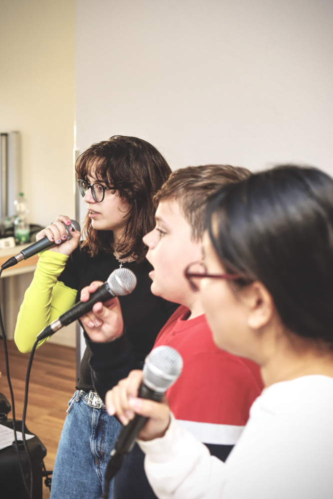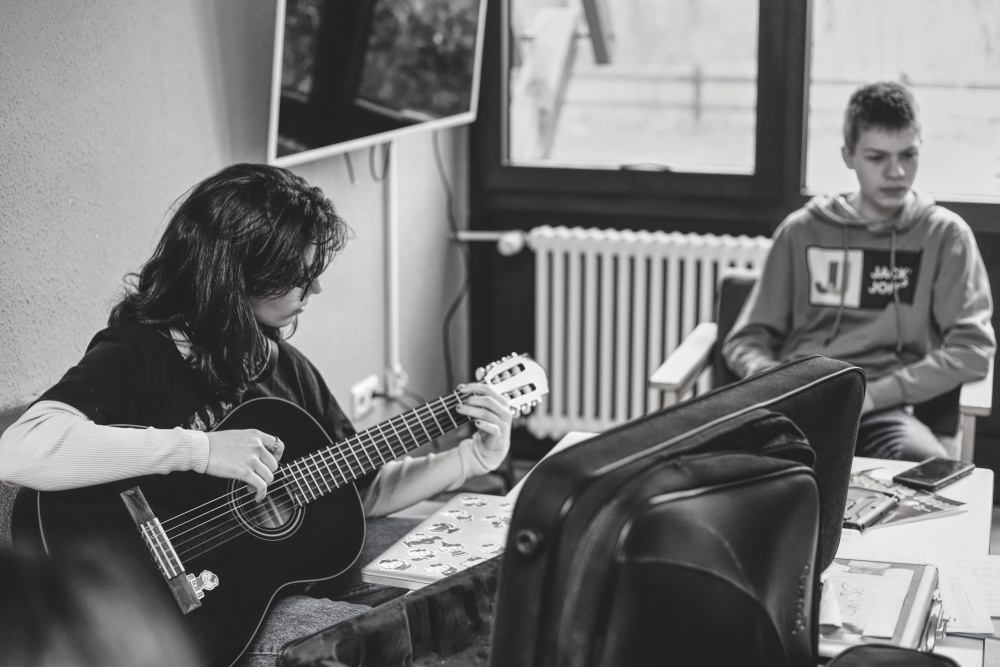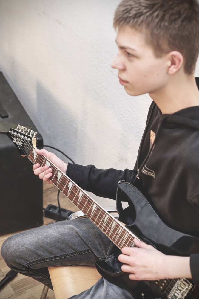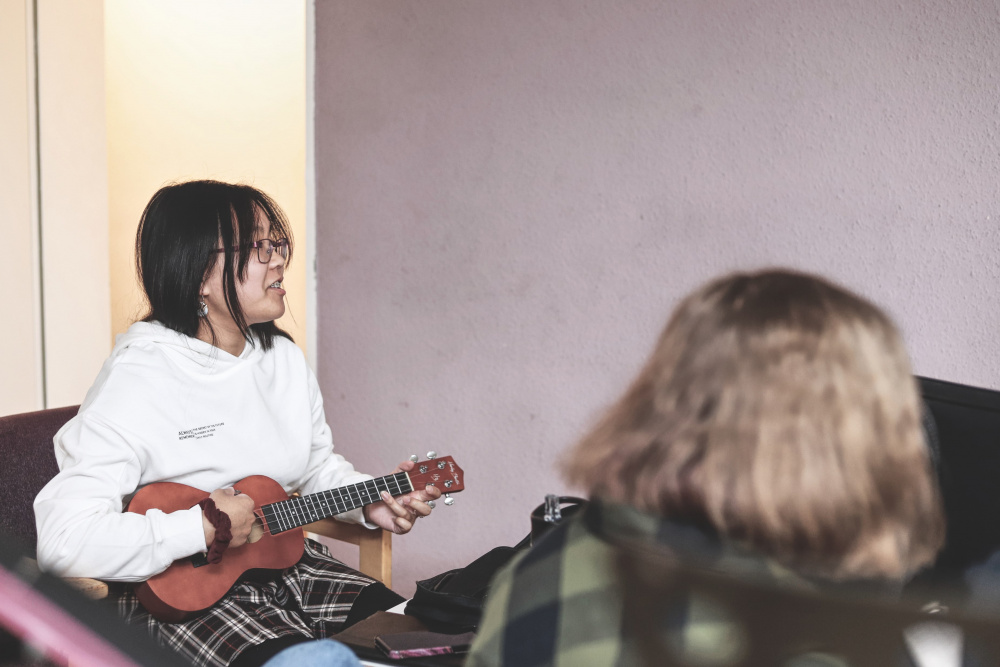 Mittwoch morgen wurden die Taschen, Koffer, Instrumente, Mikrofone, Verstärker, Lautsprecher, Notenständer und Kabel in die Autos und auf den Anhänger geladen. Diesen mitsamt Bulli und Fahrer hat uns dankenswerterweise Frau Lauxtermann vom „Riverside“ zur Verfügung gestellt! Bulli und Anhänger waren auch durchaus nötig: Schließlich mussten nicht nur insgesamt 14 Personen transportiert werden, sondern auch ein Schlagzeug, drei Akustik- und E-Gitarren sowie ein E-Bass mit verschiedenen Verstärkern, ein Stage-Piano, mehrere Ukulelen, drei Saxophone, eine Trompete und Querflöte, aber auch verschieden Percussion-Instrumente, zusätzlich noch Gesangsmikrofone mit großen Lautsprecherboxen, Kabel, Noten- und Gitarrenständer.