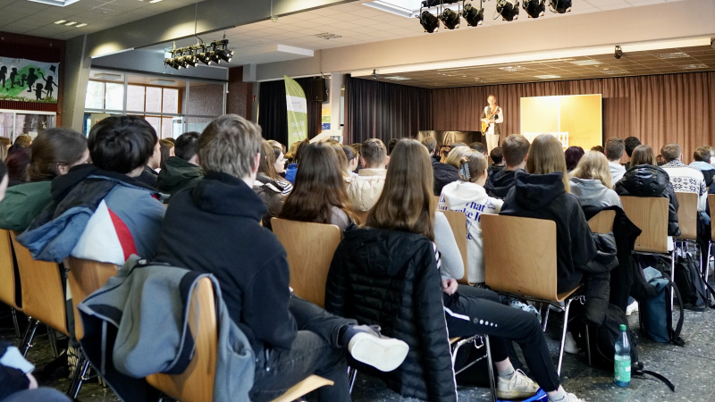 Woyzeck, Marie und der Tambourmajor, Andres, der Doktor und der Hauptmann, verkörpert nur durch einen Schauspieler. Dass das nicht nur möglich ist, sondern auch ein Publikum überzeugen und mitziehen kann, zeigte Reimund Groß von der Literaturbrauerei am 16. Februar unserer Oberstufe. Er spielte das Dramenfragment „Woyzeck“ von Georg Büchner als Ein-Mann-Stück.