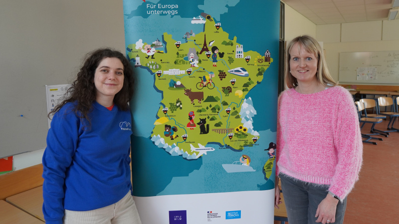 Im Anschluss an die vier Animationen, die sie bei uns in ihrer Funktion als Lektorin für das Projekt „FranceMobil“ durchgeführt hat, verriet die 28-Jährige der organisierenden Lehrkraft Anke Wilmes im Gespräch, dass sie in Frankreich nach ihrem abgeschlossenen Deutschstudium als ausgebildete Lehrerin bereits einige Jahre Berufserfahrung im Gepäck habe. Kein Wunder also, dass sie großes Geschick im Umgang mit den Jugendlichen bewies.